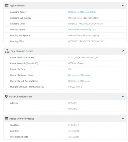Podrobnosti o pogodbi, ki jih najdete na spletnem mestu "USA Spending", dejansko razkrivajo, da je posebna služba Ministrstva za obrambo, ki je dodelila pogodbo, Agencija za zmanjšanje obrambnih nevarnosti (DTRA). Naročilo je bilo oddano 20. septembra 2012 in sklenjeno 13. oktobra 2020.