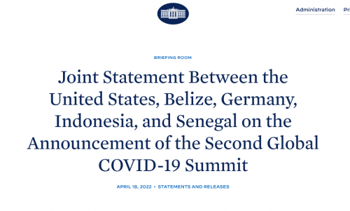 Združene države kot prvi predsednik srečanja COVID, Belize kot predsednik CARICOM; Nemčija, ki predseduje G7; Indonezija, ki predseduje G20; in Senegal kot predsednik Afriške unije z veseljem sporočamo, da bomo sogostitelji drugega svetovnega vrha o COVID-19, ki bo potekal virtualno 12. maja 2022. Vrh bo podvojil naša skupna prizadevanja za končanje akutne faze bolezni COVID -19 pandemije in pripravite na prihodnje nevarnosti za zdravje.