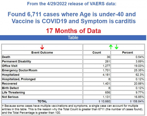 V 17 mesecih, odkar so bila cepiva proti COVID-19 odobrena, so mladi ljudje, pod 40. letom, vložili 6.711 primerov, ko so poročali o nekem tipu "karditisa", kar je povzročilo 36 smrti, 261 trajnih invalidnosti in 656 življenjsko nevarnih dogodkov. (Vir.)
