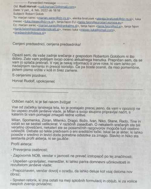 Rudolf Horvat je Tanji Fajon, Luki Mescu, Marjanu Šarcu in Alenki Bratušek poslal pismo, kjer je zapisal scenarij, kaj se je po vsej verjetnosti dogajalo v ozadju zadnjih dveh let, odkar je na oblasti Janševa vlada. Pismo je dokaz, da so “igrice” globoke države spregledane in da se jih ne da več skriti.