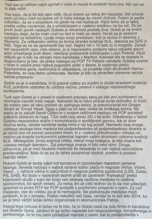 V nadaljevanju je spregledal tudi delovanje mainstream medijev, ki o Golobu pišejo le pozitivne stvari in posvaril, da nismo več leta 2014, ko državljani ne morejo dostopati tudi do drugih medijev kot sta RTV in POP TV. Takrat so omenjeni mediji brez težav lansirali lažno afero Patria. Pismo si lahko spodaj preberete v celoti. Vprašali smo tudi šefe strank KUL ali so pismo prejeli in kako ga komentirajo.