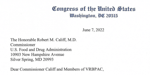 Osemnajst članov kongresa je poslalo močno pismo na FDA, v katerem zahtevajo odgovore preden regulatorji odločijo, da se odobri cepiva proti COVID-19 za dojenčke in majhne otroke, stare od 6 mesecev do 4 let. Svetovalni odbor FDA VRBPAC naj bi se sestal 15. junija, da bi razpravljal o odobritvi, in to pismo govori o dejstvu, da obstajajo vprašanja in dokazi, ki jih mora FDA upoštevati pred odobritvijo EUA (op. prev.: uporaba v sili).