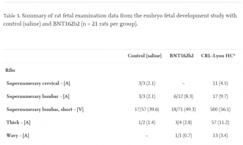 "Kombinirana študija plodnosti in razvojne toksičnosti pri podganah je pokazala povečano pojavnost presežnih ledvenih reber pri plodovih samic podgan, zdravstvenih s COMIRNATY."