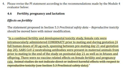 Ocenjevalec modula 4 je od Pfizerja zahteval, da odstrani njihovo trditev, da "študije na živalih ne kažejo neposrednih ali posrednih škodljivih učinkov v zvezi s strupenostjo za razmnoževanje".