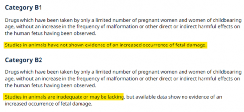 Kategorija nosečnosti je bila spremenjena v 'B1', vključena ni bila nobena vrstica o povečanem pojavu odvečnih ledvenih reber pri plodovih, ampak je bila vključena vrstica, ki je bila zahtevana za odstranitev z navedbo: "Študije na živalih ne kažejo neposrednih ali posrednih škodljivih učinkov glede nosečnosti ... ".