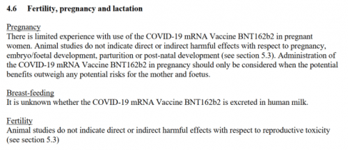 Začnimo torej z razdelkom 'Nosečnost' uradnih navodil. Decembra 2020 je bilo v smernicah navedeno, da "Cepljenje proti covidu-19 med nosečnostjo ni priporočljivo". Le kakšen mesec pozneje so te smernice navajale: 'Študije na živalih ne kažejo škodljivih učinkov na nosečnost itd.'