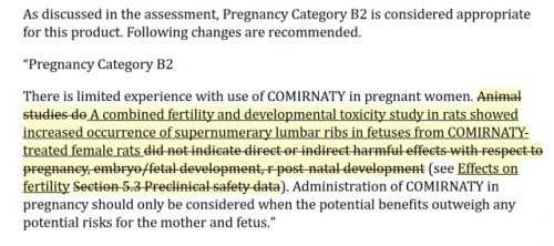 To je kar velika razlika med obema kategorijama. Toda dejstvo, da je ocenjevalec modula 4 v celoti menil, da je bila kategorija nosečnosti B2 ustrezna, je zelo vprašljivo, če so navedeni rezultati, kot smo razkrili zgoraj, "neustrezni" in so bile izjemno majhne študije o živalih izvedene za oceno varnosti dajanja zdravila Pfizer Injekcija Covid-19 med nosečnostjo.