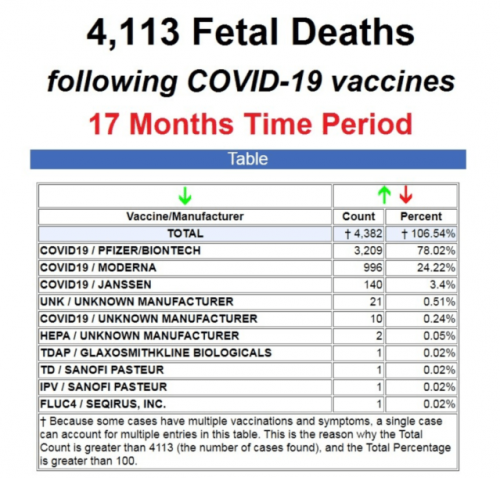 Po podatkih Centra za nadzor bolezni (CDC) Vaccine Adverse Event Database (VAERS) je bilo od aprila 2022 prijavljenih skupno 4113 smrti ploda kot posledice injekcij Covid-19, od tega 3209 prijavljenih proti injekcijam Pfizer.