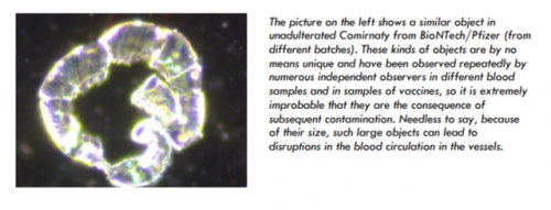 V prvem videu spodaj je bil mikroskop Zeiss Axiolab uporabljen za pregledovanje različnih serij cepiva Comirnaty (Pfizer-BioNTech). Na koncu videa je prikazanih nekaj vzorcev krvi cepljenih oseb. Strukture, podobne tistim v vialah cepiva, so našli tudi v vzorcih krvi.