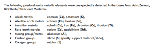 Viale cepiv proizvajalcev Pfizer-BioNTech, Moderna in AstraZeneca so bile raziskane z uporabo vrstične elektronske mikroskopije (»SEM«) in ustrezne energijsko disperzivne rentgenske spektroskopije (»EDX«). Zaznani so bili naslednji pretežno kovinski elementi: