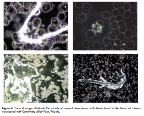 V vseh odvzetih vzorcih krvi cepljenih ljudi so našli kristalne tvorbe. "Še naprej analiziramo te formacije," so zapisali avtorji. Skupina je opazila tudi rouleaux formacije rdečih krvnih celic v vseh vzorcih cepljenih oseb in "pogosto opazila nenavadno hiter razpad različnih vrst celic v cepljeni krvi."