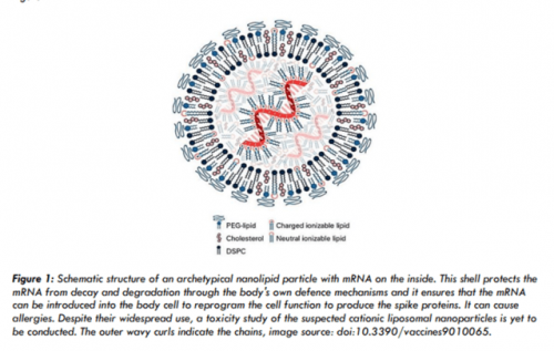 MRNA potrebuje zaščitno ovojnico, da vstopi v celice. Ta zaščitna ovojnica je sestavljena iz nano lipidov. Nano lipidi so stabilizirani s plastmi polietilen glikola ("PEG"). PEG je sestavljen iz verig različnih dolžin. Struktura nano lipidnega delca, ki ščiti mRNA, je shematično prikazana spodaj: