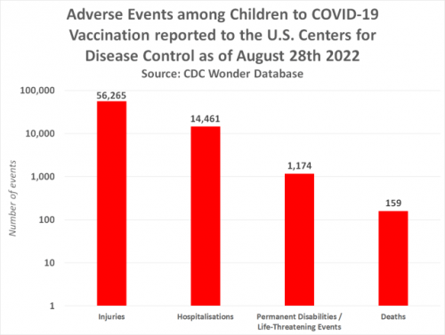Na žalost CDC razkriva, da je do 26. avgusta 2022 vsaj 56.265 otrok (starih od 0 do 17 let) utrpelo poškodbo zaradi cepljenja proti Covid-19.