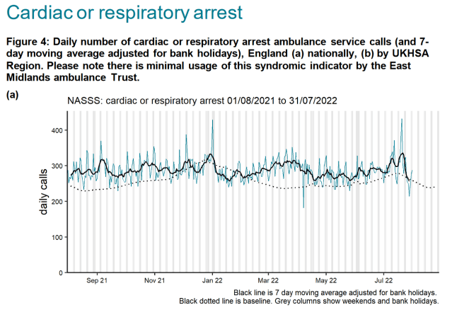 Naslednja tabela je vzeta iz biltena Ambulance Syndromic Surveillance System – Week 3 0′ Agencije za zdravstveno varnost Združenega kraljestva in prikazuje dnevno število 999 klicev, ki zahtevajo reševalno vozilo zaradi srčnega zastoja v Angliji v primerjavi s pričakovano stopnjo (črna pikčasta črta ).