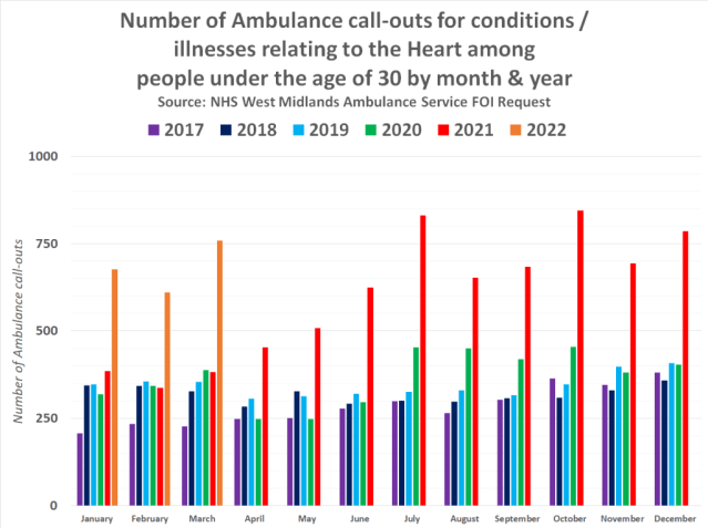 Nacionalna zdravstvena služba (NHS) je v odgovor na zahtevo po svobodi obveščanja tudi potrdila, da so se klici rešilcev v zvezi s takojšnjo oskrbo, potrebno za izčrpavajoče stanje, ki prizadene srce, skoraj podvojili v celotnem letu 2021 in še vedno naraščajo. 2022.