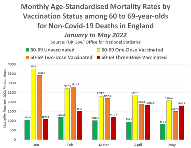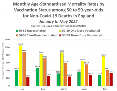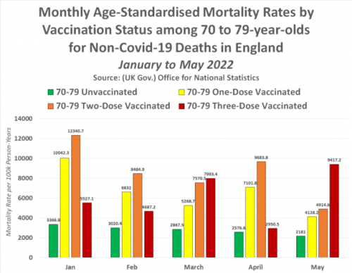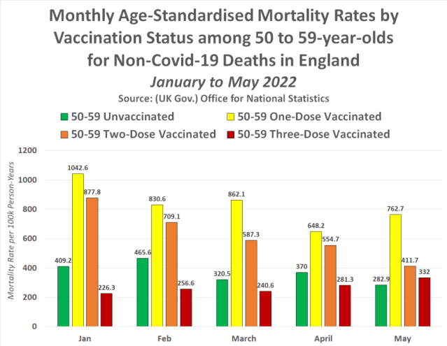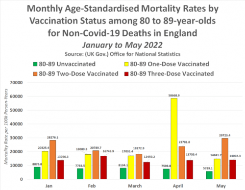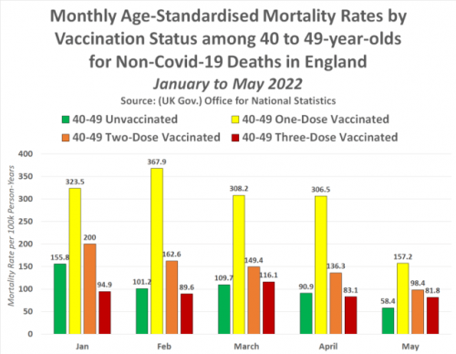 V vsakem posameznem mesecu od začetka leta 2022 je bilo pri delno cepljenih in dvakrat cepljenih 18-39-letnikih večja verjetnost smrti kot pri necepljenih 18- do 39-letnikih. Trikrat cepljeni ljudje, stari od 18 do 39 let, pa so imeli stopnjo umrljivosti, ki se je poslabšala v mesecu po množični kampanji Booster, ki je potekala v Združenem kraljestvu decembra 2021.