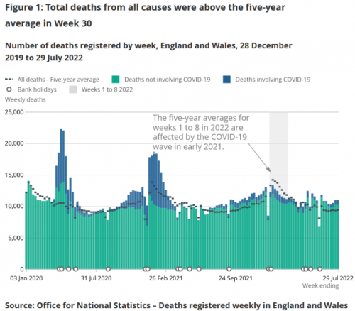 Toda videz je lahko zavajajoč in edini razlog, da so opustili, je ta, da se je ONS odločil, da podatke za leto 2021 vključi v 5-letno povprečje. Zato je še toliko bolj zaskrbljujoče, da so od konca aprila 2022 vsak teden zabeležili presežne smrti v primerjavi s petletnim povprečjem ( 2016 do 2019 + 2021 ).