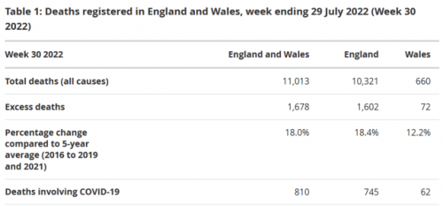 Zadnji teden kaže, da je bilo v Angliji in Walesu 11.013 smrti, kar je 1.678 smrtnih žrtev več od petletnega povprečja. Le 810 od teh smrti je bilo pripisanih Covidu-19.
