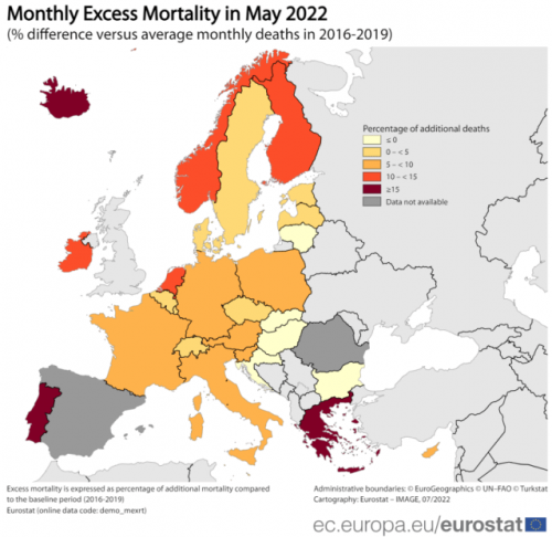 Večina Evrope prav tako beleži znatno število presežnih smrti, kot je razvidno iz naslednjega uradnega grafikona, ki ga je sestavil Eurostat in prikazuje presežek umrljivosti po vsej Evropi maja 2022 –