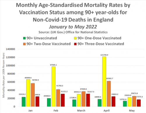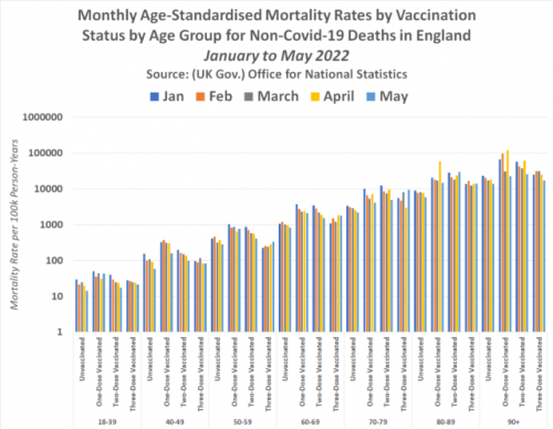 Naslednji grafikoni prikazujejo mesečne starostno standardizirane stopnje umrljivosti glede na status cepljenja med vsako starostno skupino za smrti brez covida-19 v Angliji med januarjem in majem 2022, številke lahko najdete v tabeli 2 nedavno objavljenega nabora podatkov , ki ga je zbralo Združeno kraljestvo. Državna agencija, urad za državno statistiko –