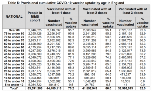 Naslednja tabela je vzeta iz strani 65 27. tedna Agencije za zdravstveno varnost Združenega kraljestva ' Tedensko nacionalno poročilo o nadzoru gripe in COVID-19' in prikazuje uporabo cepiva v Angliji glede na starost –