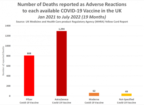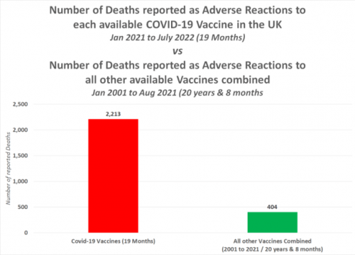 Medicinski regulator Združenega kraljestva je potrdil, da so v obdobju devetnajstih mesecev cepiva proti covidu-19 povzročila vsaj 5,5-krat toliko smrti kot vsa druga razpoložljiva cepiva skupaj v zadnjih 21 letih. To pomeni, da so injekcije Covid-19, če jih primerjamo eno ob drugi, šokantnih 7402 % bolj smrtonosne od vseh drugih cepiv, ki so na voljo v Združenem kraljestvu.