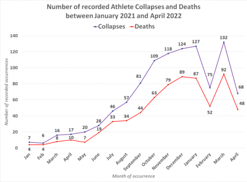 Naslednji grafikon prikazuje število zabeleženih kolapsov in smrti športnikov med januarjem 2021 in aprilom 2022, z dovoljenjem zgornjega povezanega seznama –