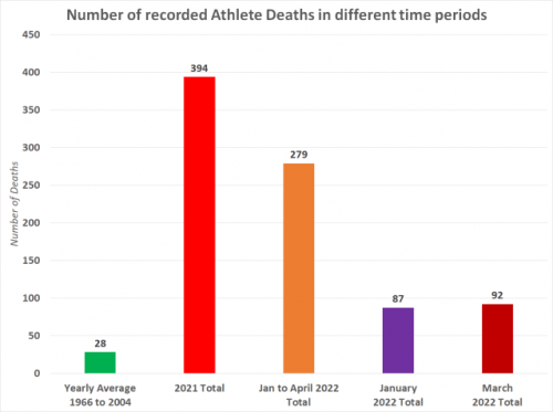 Letno povprečno število smrti med letoma 1966 in 2004 je enako 28. Januarja 2022 je bilo 3-krat več smrti športnikov kot to prejšnje letno povprečje, prav tako marca 2022. Torej je to očitno zelo indikativno za težavo.