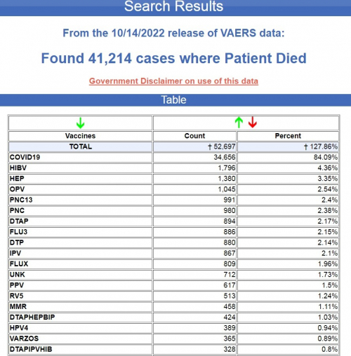 Od odobritve nujne uporabe cepiv proti COVID-19 decembra 2020 do zadnje posodobitve baze podatkov VAERS 14. oktobra 2022 je bilo 84 % vseh smrti, prijavljenih po cepljenju v zadnjih 31+ letih, prijavljenih po cepivih COVID-19. (Vir.)
