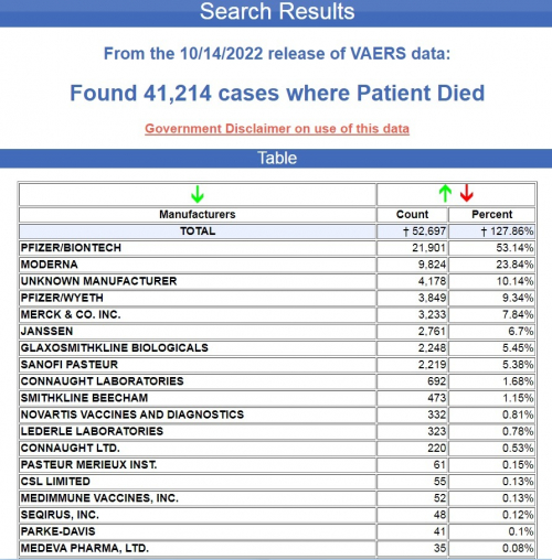 Podjetje, ki je proizvedlo največ cepiv, ki so povzročila smrtne primere, zabeležene v VAERS, je Pfizer, in to čast so imeli, že preden sodelovanjem z Biontechom pri izdelavi njihovega mRNA cepiva proti COVID-19, še ko so sodelovali z Wyethom pri proizvodnji različnih drugih cepiv.