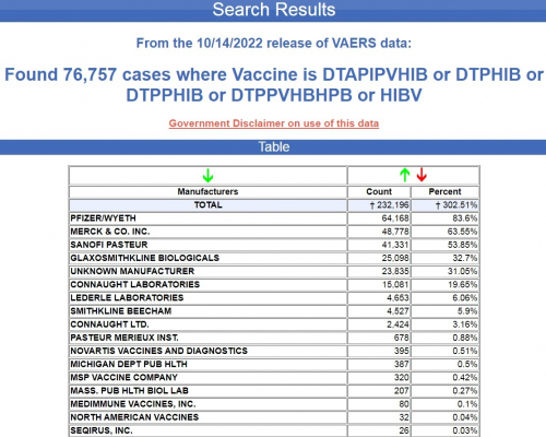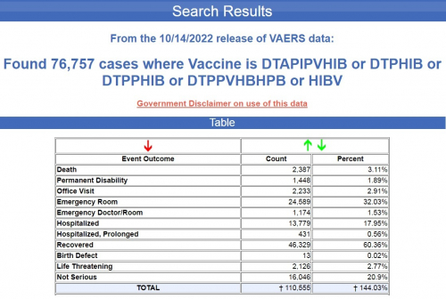 Torej, na podlagi te državne statistike je bil v VAERS prijavljen primer po cepivih proti HIB na vsakih 4.107 danih odmerkov, o smrti pa je bilo poročano v VAERS po cepivih proti HIB na vsakih 157.281 danih odmerkov.