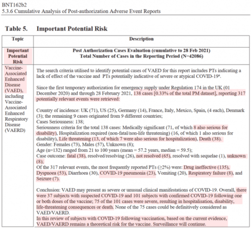 Toda Pfizer je vseeno dokončno ugotovil, za namene svojih podatkov o varnosti, ki so jih predložili Uradu za hrano in zdravila (FDA), prav tistih podatkov, ki so bili potrebni za pridobitev dovoljenja za uporabo v nujnih primerih in jim prinesel milijarde in milijarde dolarjev, da "nobenega od 75 primerov ne bi mogli dokončno obravnavali kot VAED".