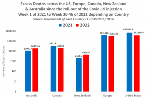 Uradna poročila, ki so jih objavile vlade ZDA, Kanade, Avstralije, Nove Zelandije, Združenega kraljestva in večine Evrope, potrjujejo, da je bilo od množičnega uvajanja injekcij Covid-19 zabeleženih 1,8 milijona presežnih smrti.