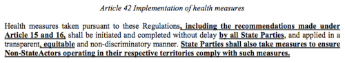 S predlaganimi spremembami naj bi iz opredelitev začasnih in stalnih priporočil, ki jih daje Svetovna zdravstvena organizacija, črtali besedi "nezavezujoče". V povezavi s členom 42 (Izvajanje zdravstvenih ukrepov), ki pravi: "Zdravstvene ukrepe, vključno s priporočili iz členov 15 in 16, vse države pogodbenice začnejo in dokončajo brez odlašanja." To spreminja svetovalno vlogo Svetovne zdravstvene organizacije v totalitarno diktaturo. Izjave SZO so trenutno priporočila, NE pa ukazi ljudem na Zemlji. (Stran 2)