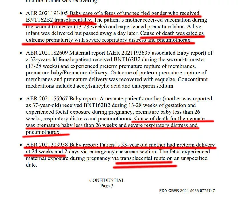 Na strani 3 podjetje Pfizer opisuje dva primera (od 458) nerojenih otrok, prizadetih zaradi transplacentnega prenosa mRNA cepiva Covid. Pfizerjeve lastne besede: