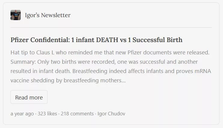 Pfizerjevo poročilo, ki na strani 6 navaja neželene učinke pri dojenih dojenčkih, ne omenja nobenega mrtvega dojenčka, ki je umrl med dojenjem. Vendar prejšnje Prizerjevo postmarketinško poročilo omenja enega dojenega dojenčka, ki je umrl kmalu po cepljenju svoje matere. Pred enim letom sem pisal o tem dojenčku.