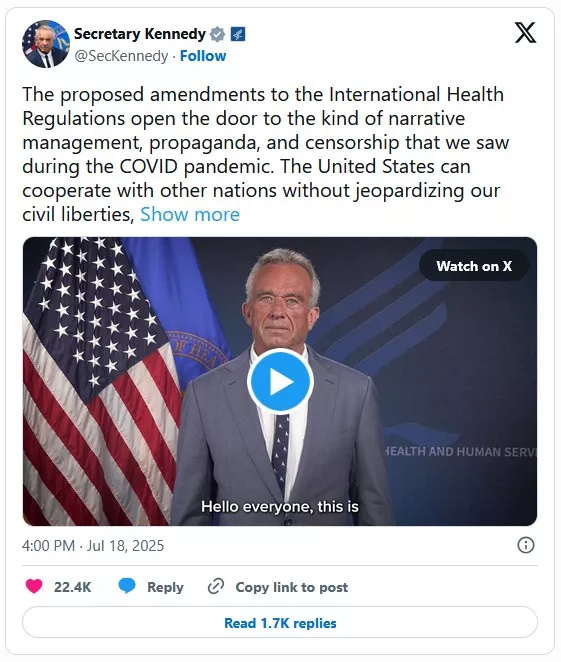 Minister za zdravje Robert F. Kennedy ml. je napovedal vojno Svetovni zdravstveni organizaciji in pogumno sporočil, da ZDA s predlaganimi spremembami Mednarodnega zdravstvenega pravilnika popolnoma zavračajo njeno tiransko agendo. RFK trdi, da te spremembe ogrožajo nacionalno suverenost, saj predpisujejo nadzor, propagando in cenzuro za nadzor ameriške javnosti.