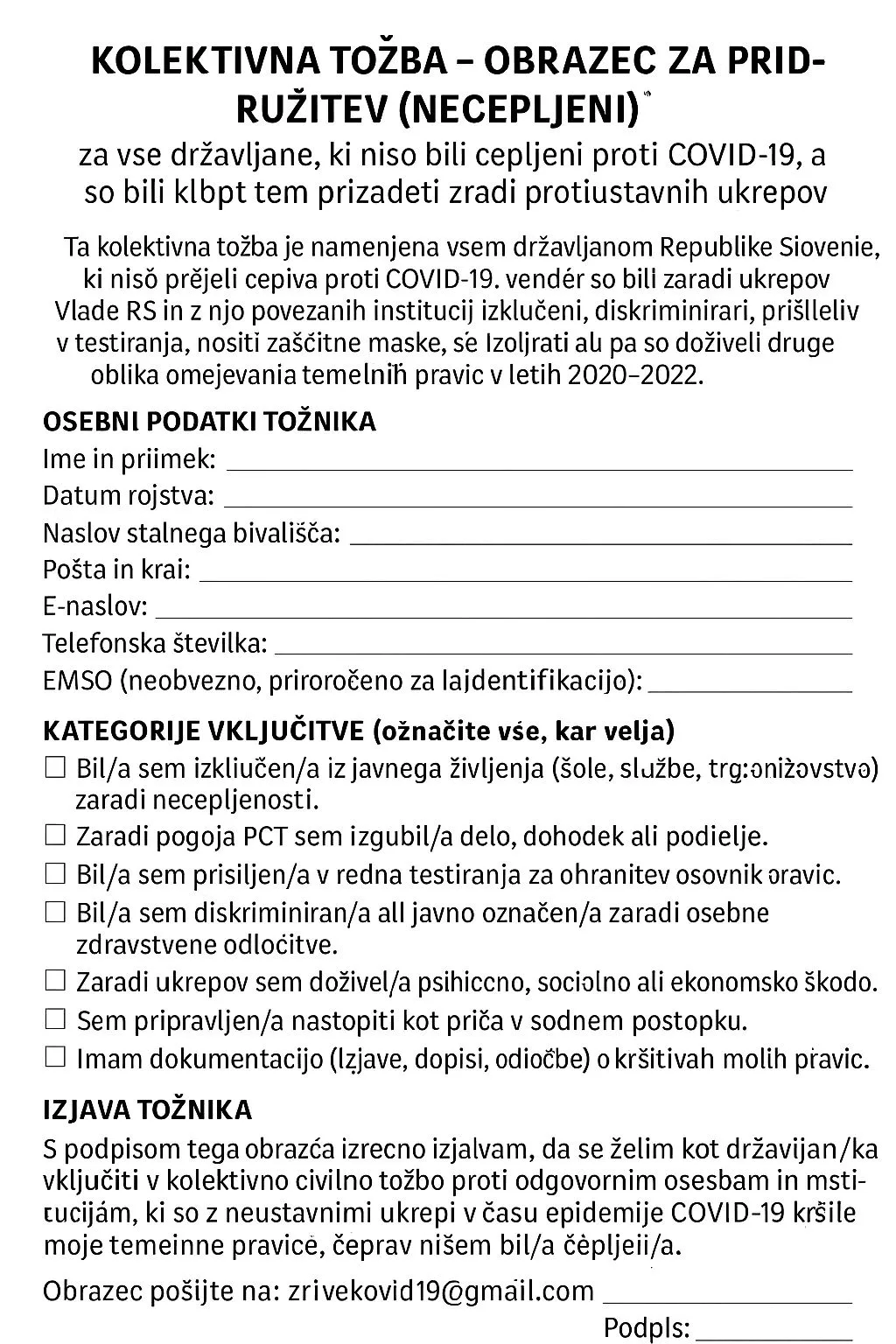 Tožniki, državljani Republike Slovenije, nismo bili cepljeni proti COVID-19, vendar smo bili zaradi ukrepov Vlade RS in z njo povezanih institucij izključeni, diskriminirani in omejevani pri uresničevanju svojih osnovnih človekovih pravic in svoboščin. Ti ukrepi so zajemali izključitev iz javnega življenja, prisilno testiranje, policijske ure, karantene brez pravne podlage, šolanje otrok na daljavo, onemogočanje zdravstvene oskrbe, prepoved opravljanja dela in gospodarsko škodo. Ukrepi so povzročili številne psihološke, socialne in ekonomske posledice, ki so za posameznike in družbo dolgoročne in nepopravljive.