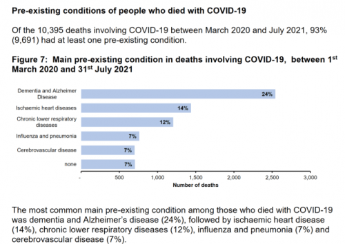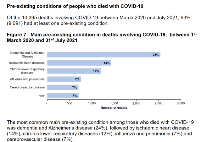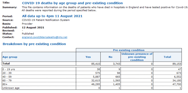 Podatki NHS za Anglijo kažejo, da je od marca 2020 do 12. avgusta 2021 zaradi Covid-19 domnevno umrlo 3.743 ljudi, ki niso imeli drugih predhodnih bolezni (prirojenih bolezni) vključno z demenco, kronično ledvično boleznijo, kronično pljučno boleznijo, kronično nevrološko boleznijo in bolezni srca.