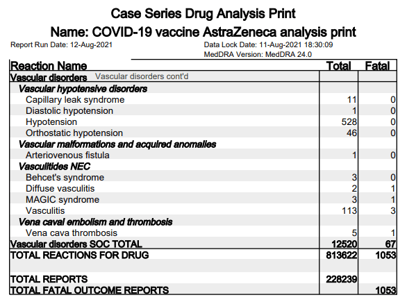 As well as 813,622 adverse reactions and 1,053 deaths reported to the MHRA against the AstraZeneca viral vector injection.