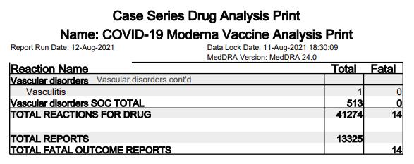 The Moderna mRNA injection meanwhile has caused at least 41,274 adverse reactions and 14 deaths as of the 11th August 2021. This vaccine has also mainly been administered to younger adults who are least at risk of suffering debilitating disease if infected with Covid-19. Around 1.4 million people have received the Moderna jab which means at least 1 in every 33 people have suffered and adverse reaction and at least 1 in every 100,000 people have sadly died.