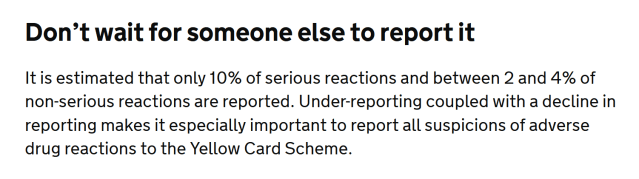 But it’s also important to remember that the MHRA have stated just 10% of serious adverse reactions are reported to the MHRA Yellow Card scheme.