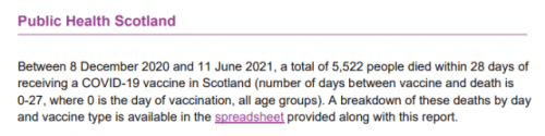 Even when adding the number of people who have died of Covid-19 in both England and Scotland together; which comes to 4,447 deaths in 18 months, there have still been 1,075 more deaths within 28 days of having a Covid-19 vaccine in Scotland.