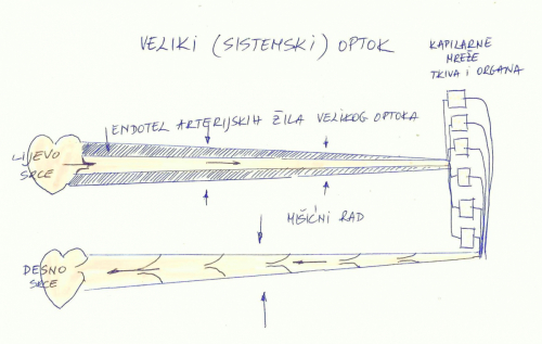 Skrećem pažnju da istu fenomenologiju nuspojava imamo kod cijepljenih i kod oboljelih što znači da virus i antivirusno cjepivo inducirano mRNK tehnologijom imaju nešto zajedničko! Spike proteine! Virus ih nosi na površini i infekcijom unosi u pluća, a mRNK tehnologijom sami postajemo njihovi proizvođači i krvotokom ih unosimo u pluća. U tijelu postoje dva krvotoka. Veliki, koji hranom i kisikom opskrbljuje tijelo i mali (ili plućni) kojim se krv obogaćuje kisikom. Postoje i dva srca spojena u jedno. Lijevo srce "brine" za veliki, a desno za mali krvotok. Opterećenja su im jednaka. Koliko krvi prođe tijelom, toliko prođe i kroz pluća. Na slici 1 pojednostavljeno je prikazan veliki krvotok. Lijevo srce pumpa krv u arterijske žile. One su ojačane posebnim mišićnim ovojem (endotel, iscrtkano) koji stezanjem pomaže srcu da krv dopre do udaljenih tkiva i organa. Prolaskom kroz kapilare, venska krv se vraća u desno srce venskim žilama koje nemaju endotel. Ulogu endotela u vraćanju venske krvi u srce preuzimaju tjelesni mišići. Kretanje i vježbanje stoga pomaže cirkulaciji.