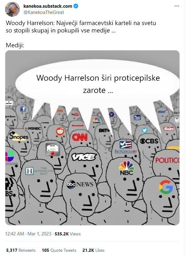Zerohedge.com poroča: Harrelson je na vprašanje, kaj je "absurdno pri protokolih COVID", odgovoril: "Dejstvo, da se še vedno izvajajo!"