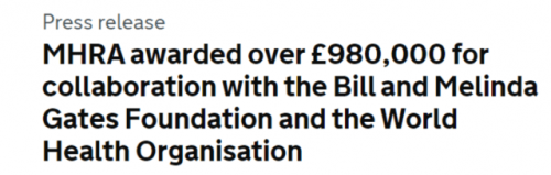 MHRA je leta 2017 od fundacije Bill & Melinda Gates prejela nepovratna sredstva v vrednosti 980.000 funtov za "sodelovanje" s fundacijo. Vendar pa je zahteva po svobodi informacij (op. prev.: dostop do informacij javnega značaja), na katero je MHRA odgovoril maja 2021, razkrila, da trenutna raven nepovratnih sredstev, prejetih od fundacije Gates, znaša 3 milijone dolarjev in pokriva "število projektov".