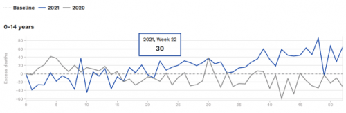 Kot je razvidno iz zgoraj navedenega, je bilo število smrti otrok v letu 2020 na splošno pod pričakovanim številom smrti. Ta trend se je nadaljeval vse leto 2021 do 22. tedna, ko so bile iz tedna v teden do konca leta zabeležene presežne smrti.
