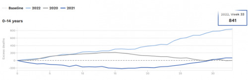 Povprečno število presežnih smrti med letom 2018 in 2021 med 1. in 33. tednom je enako 175. Danes v prvih 33 tednih leta 2022 je bilo 841 več smrti med otroki, kar je bilo pričakovano, in 666 več smrti kot je povprečje med letom 2018 in 2021.