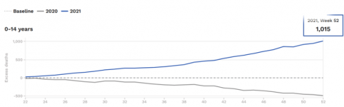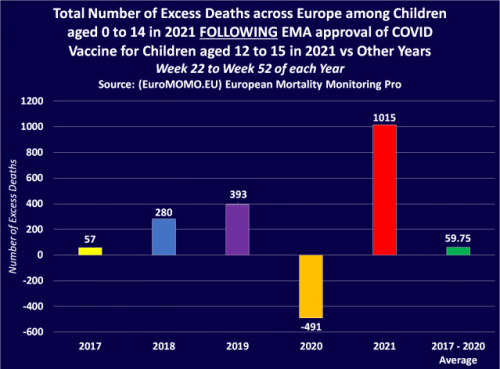 Povprečno število čezmernih smrti med otroki v Evropi med 22. in 52. tednom v letih 2017–2020 znaša 59,75. Toda v istem obdobju leta 2021, potem ko je EMA odobrila cepivo Pfizer Covid-19 za otroke, je bilo 1.015 več smrti med otroki, kot je bilo pričakovano, in 955,25 več smrti od povprečja od 2017 do 2020.