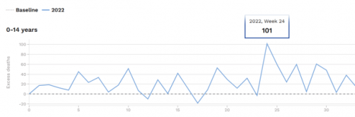 Zaenkrat zajemajo podatke do 33. tedna leta 2022 (sredina avgusta) in kot lahko vidite, je bilo večino tednov smrtnih primerov med otroki precej nad pričakovanji. V 24. tednu je bila zabeležena rekordna 101 smrtna žrtev med otroki, starimi od 0 do 14 let.